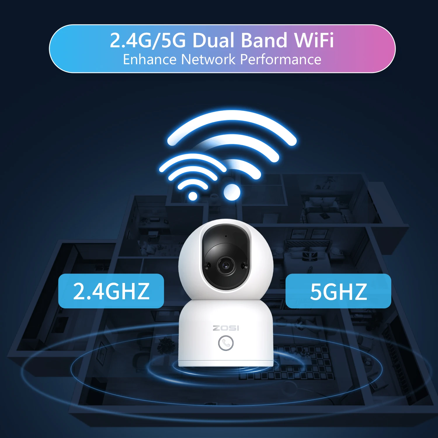 This indoor camera works on both 2.4GHz and 5GHz WiFi. Choose the WiFi band that suits your needs